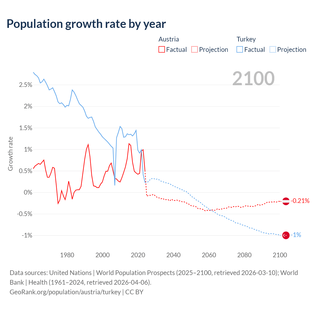 - For the last 10 years, Austria has had an average growth rate of +0.72% per year vs +1.06% in Turkey.