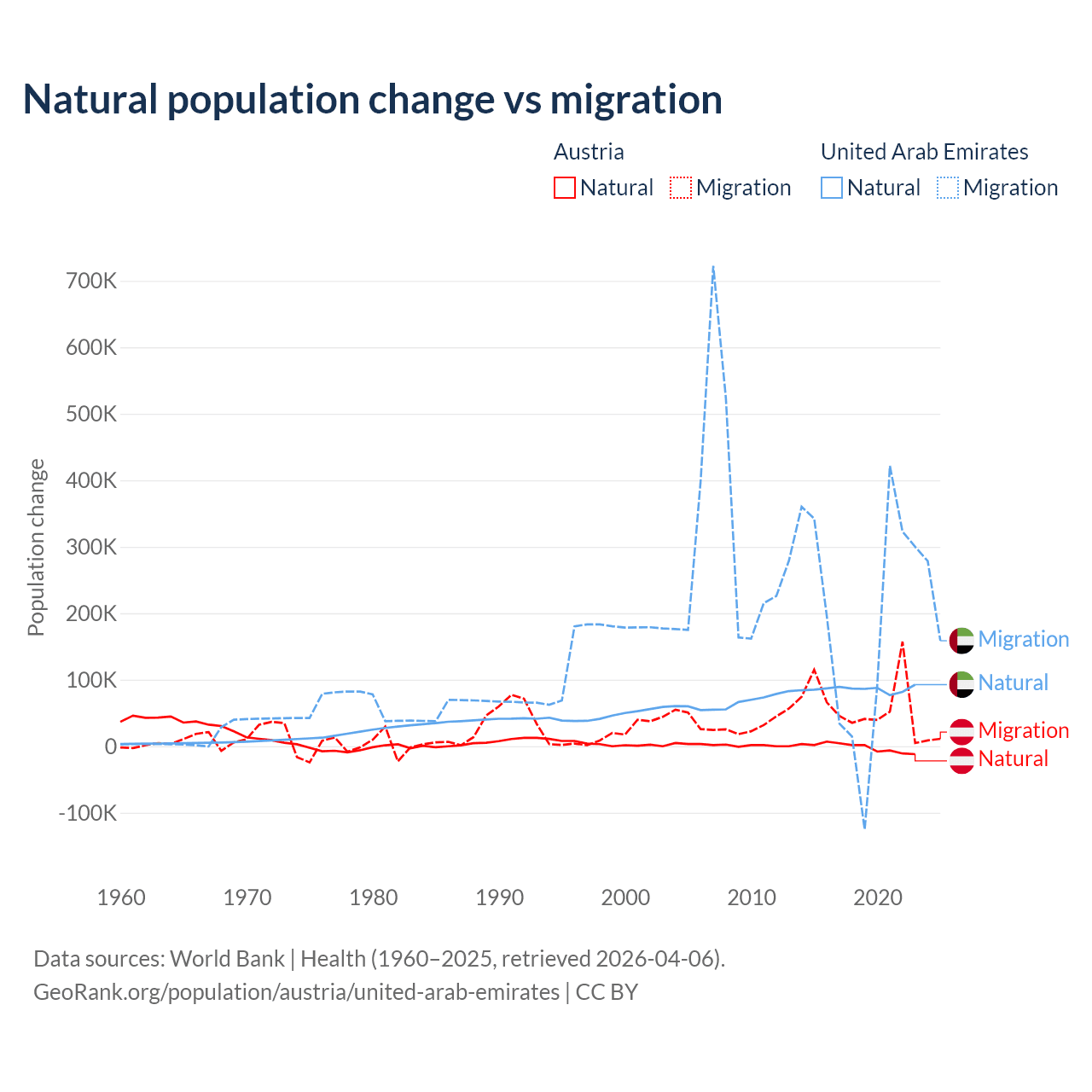 Over the last 10 years, 2.61% of the population change in Austria is from natural causes (a loss of 16,936 people) and 97.4% is from migration (a gain of 631,325 people). In the United Arab Emirates 30.5% is from natural causes (a gain of 857,996 people) and 69.5% is from migration (a gain of 1,958,520 people).