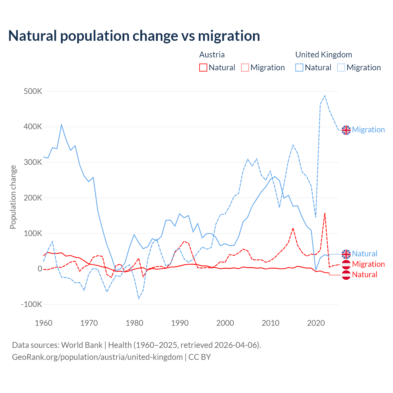 Over the last 10 years, 2.61% of the population change in Austria is from natural causes (a loss of 16,936 people) and 97.4% is from migration (a gain of 631,325 people). In the United Kingdom 23.9% is from natural causes (a gain of 1,033,129 people) and 76.1% is from migration (a gain of 3,283,101 people).