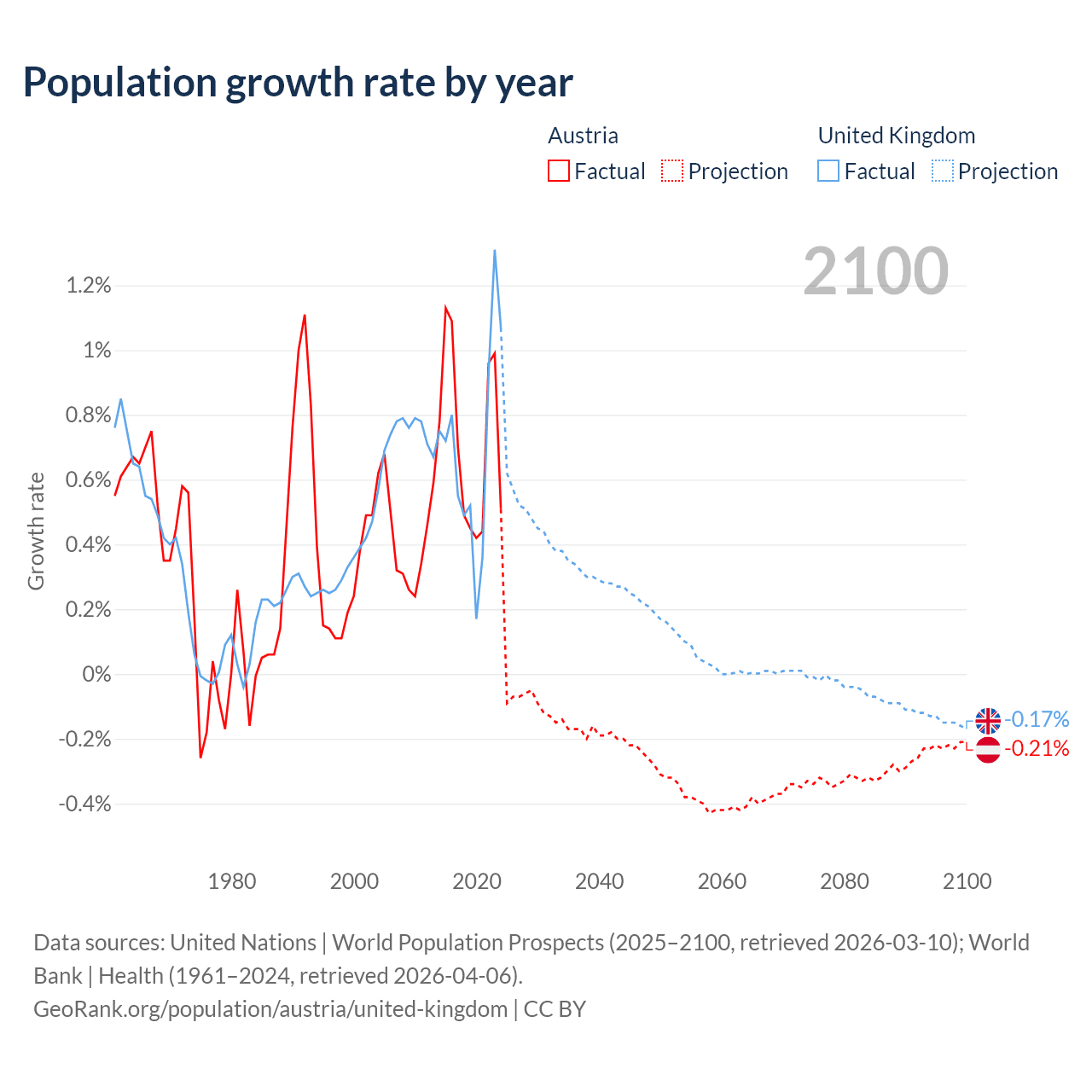 - For the last 10 years, Austria has had an average growth rate of +0.72% per year vs +0.7% in the United Kingdom.