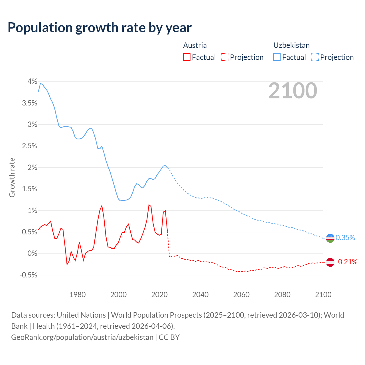 - For the last 10 years, Austria has had an average growth rate of +0.72% per year vs +1.85% in Uzbekistan.