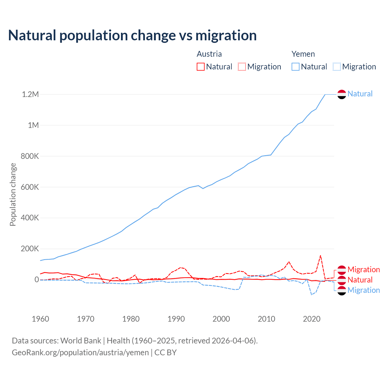 Over the last 10 years, 2.61% of the population change in Austria is from natural causes (a loss of 16,936 people) and 97.4% is from migration (a gain of 631,325 people). In Yemen 97.8% is from natural causes (a gain of 10,460,813 people) and 2.17% is from migration (a loss of 231,814 people).