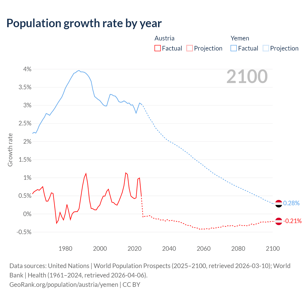 - For the last 10 years, Austria has had an average growth rate of +0.72% per year vs +3% in Yemen.