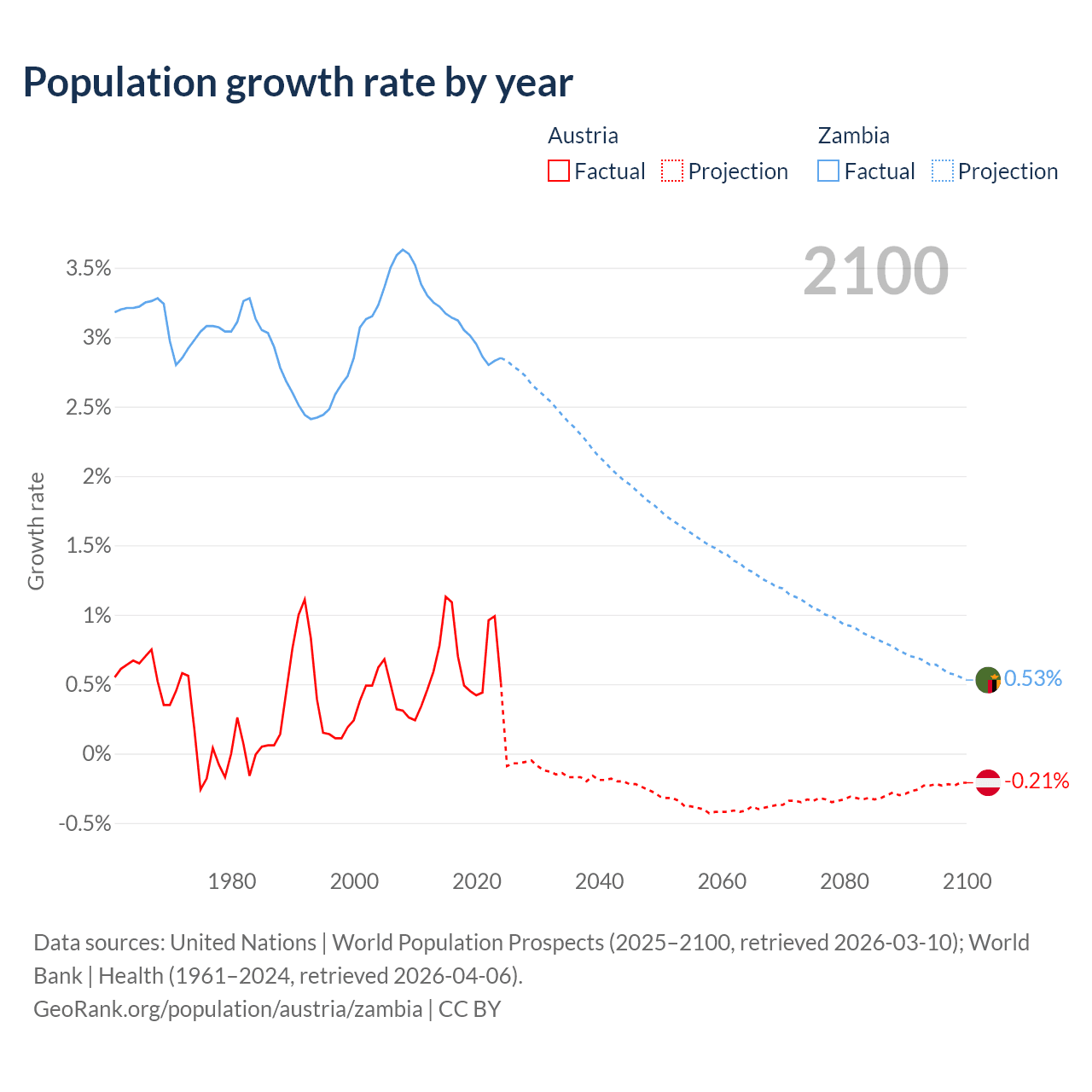 - For the last 10 years, Austria has had an average growth rate of +0.72% per year vs +3% in Zambia.