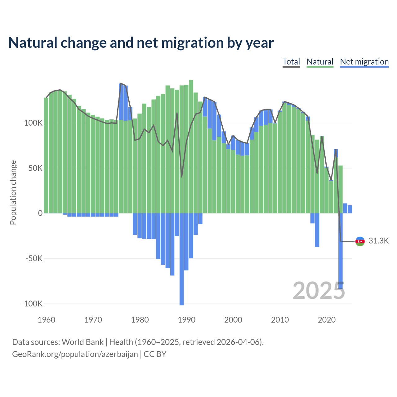 Over the last 10 years, 87.2% of the population change in Azerbaijan is from natural causes (a gain of 782,840 people) and 12.8% is from migration (a loss of 114,572 people).