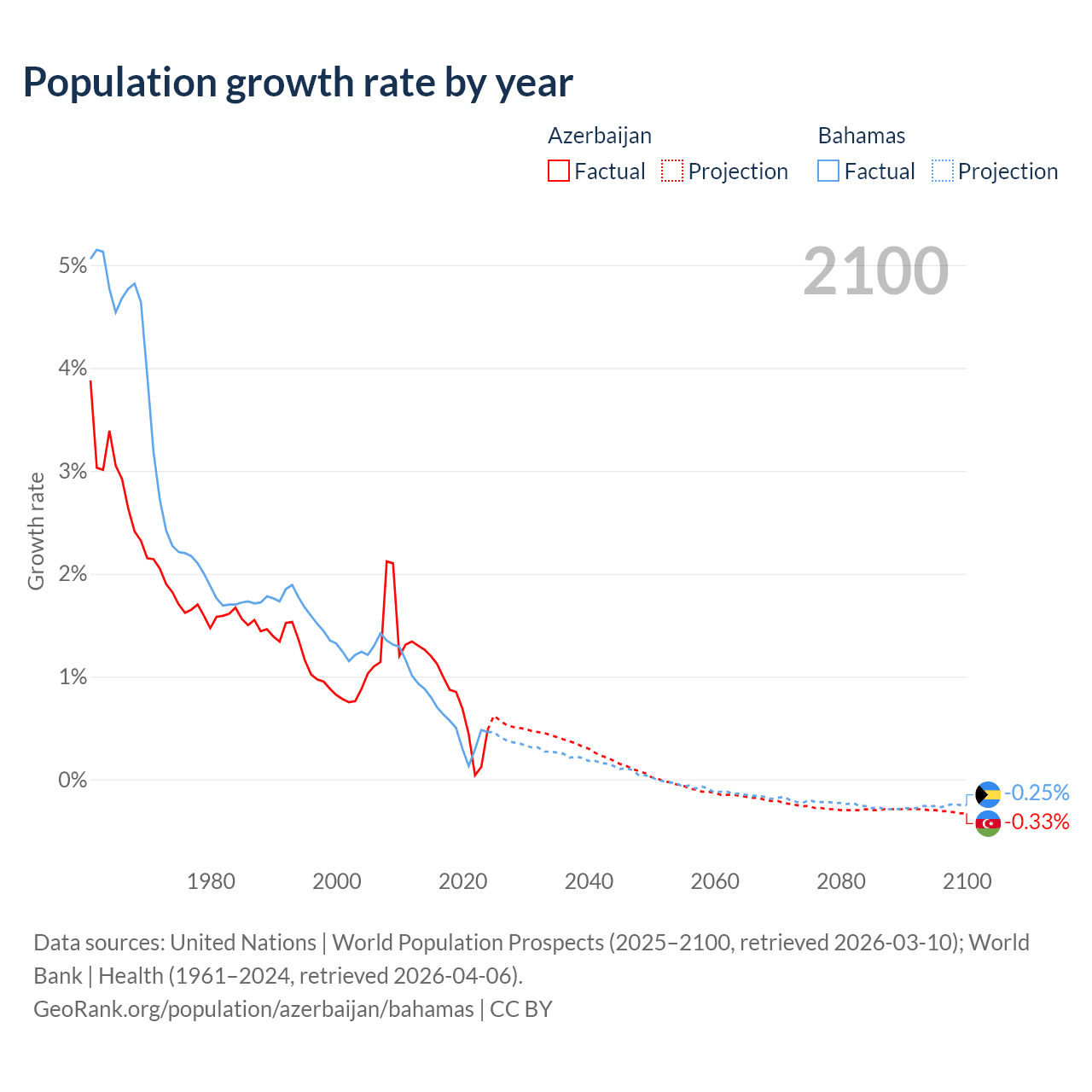 - For the last 10 years, Azerbaijan has had an average growth rate of +0.73% per year vs +0.52% in the Bahamas.