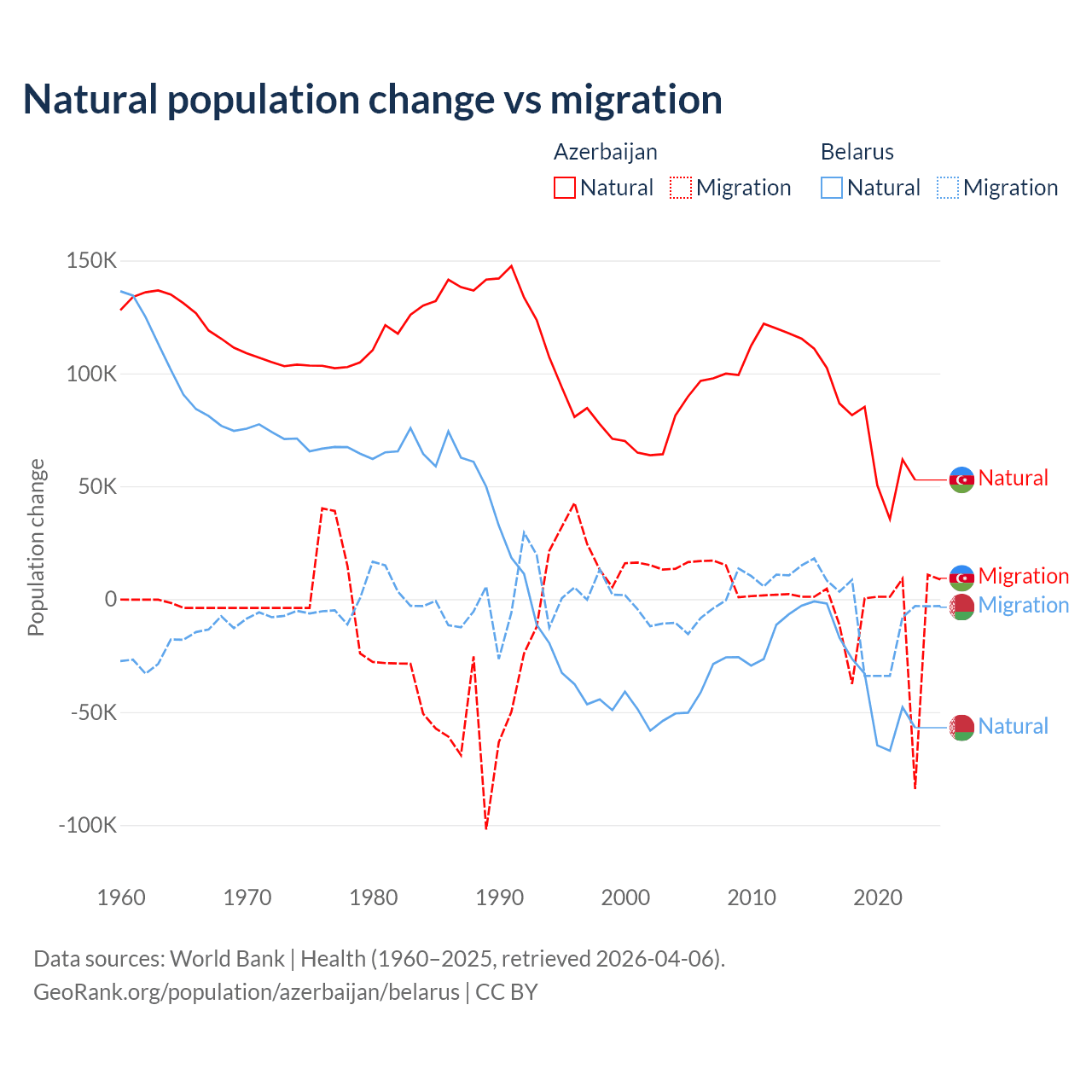 Over the last 10 years, 87.2% of the population change in Azerbaijan is from natural causes (a gain of 782,840 people) and 12.8% is from migration (a loss of 114,572 people). In Belarus 84.2% is from natural causes (a loss of 318,682 people) and 15.8% is from migration (a loss of 59,605 people).
