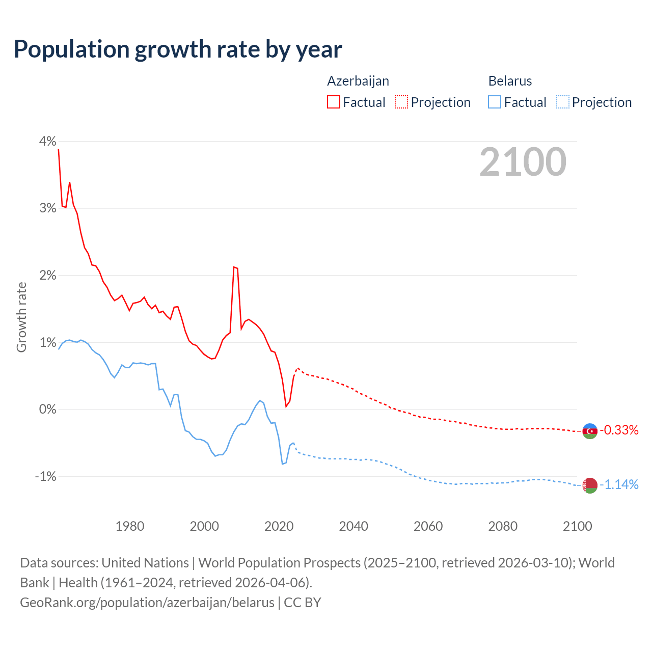 - For the last 10 years, Azerbaijan has had an average growth rate of +0.73% per year vs -0.3% in Belarus.
