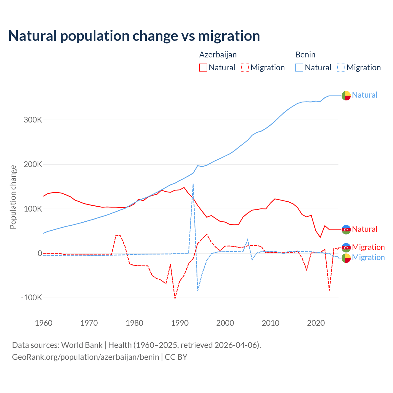 Over the last 10 years, 87.2% of the population change in Azerbaijan is from natural causes (a gain of 782,840 people) and 12.8% is from migration (a loss of 114,572 people). In Benin 99.3% is from natural causes (a gain of 3,397,218 people) and 0.71% is from migration (a gain of 24,401 people).