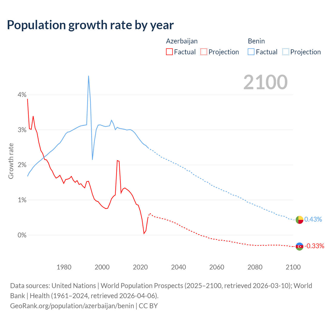 - For the last 10 years, Azerbaijan has had an average growth rate of +0.73% per year vs +2.77% in Benin.