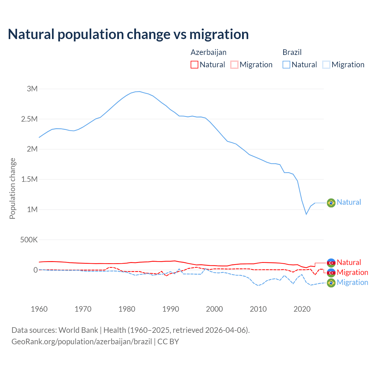 Over the last 10 years, 87.2% of the population change in Azerbaijan is from natural causes (a gain of 782,840 people) and 12.8% is from migration (a loss of 114,572 people). In Brazil 89.1% is from natural causes (a gain of 14,004,164 people) and 10.9% is from migration (a loss of 1,708,894 people).