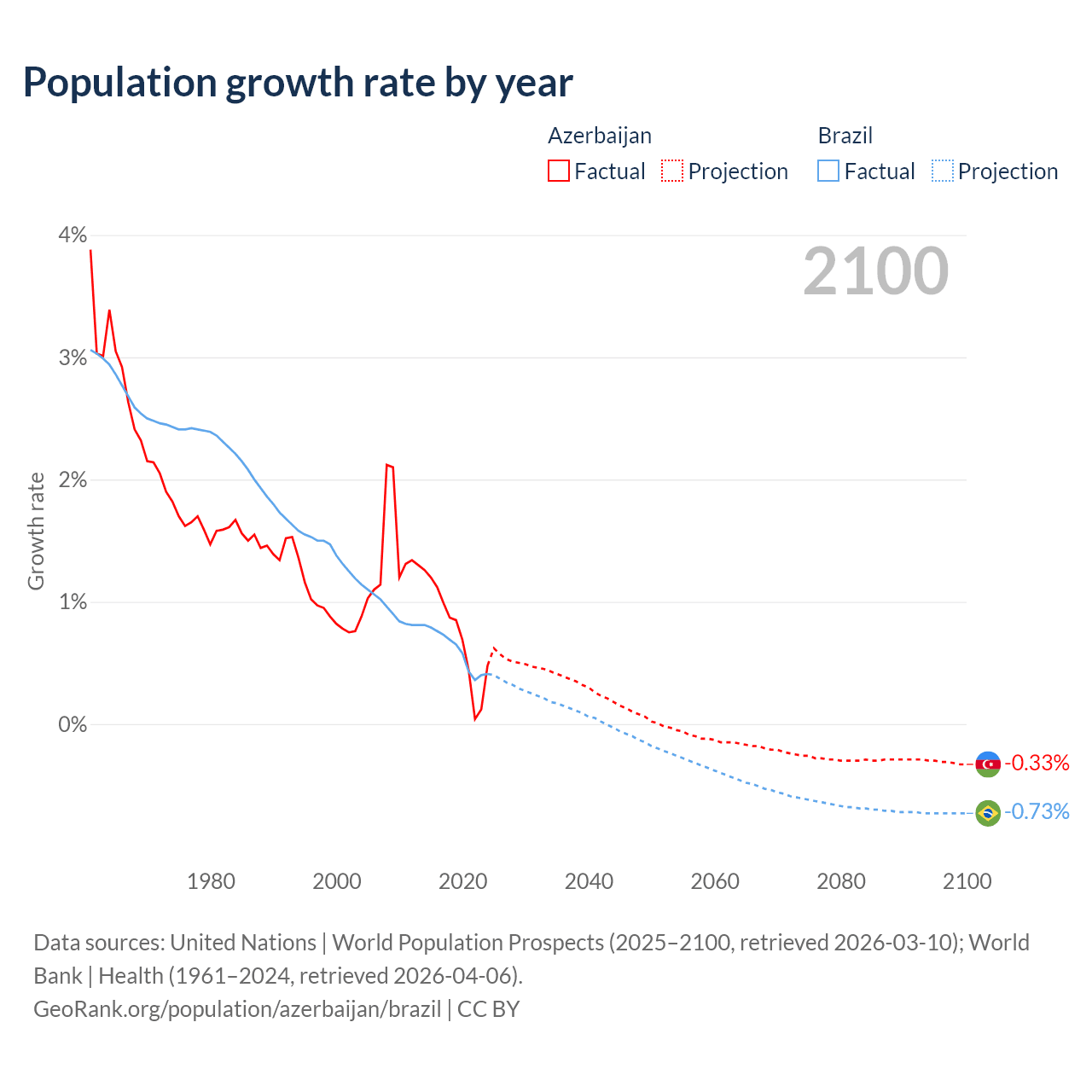 - For the last 10 years, Azerbaijan has had an average growth rate of +0.73% per year vs +0.6% in Brazil.