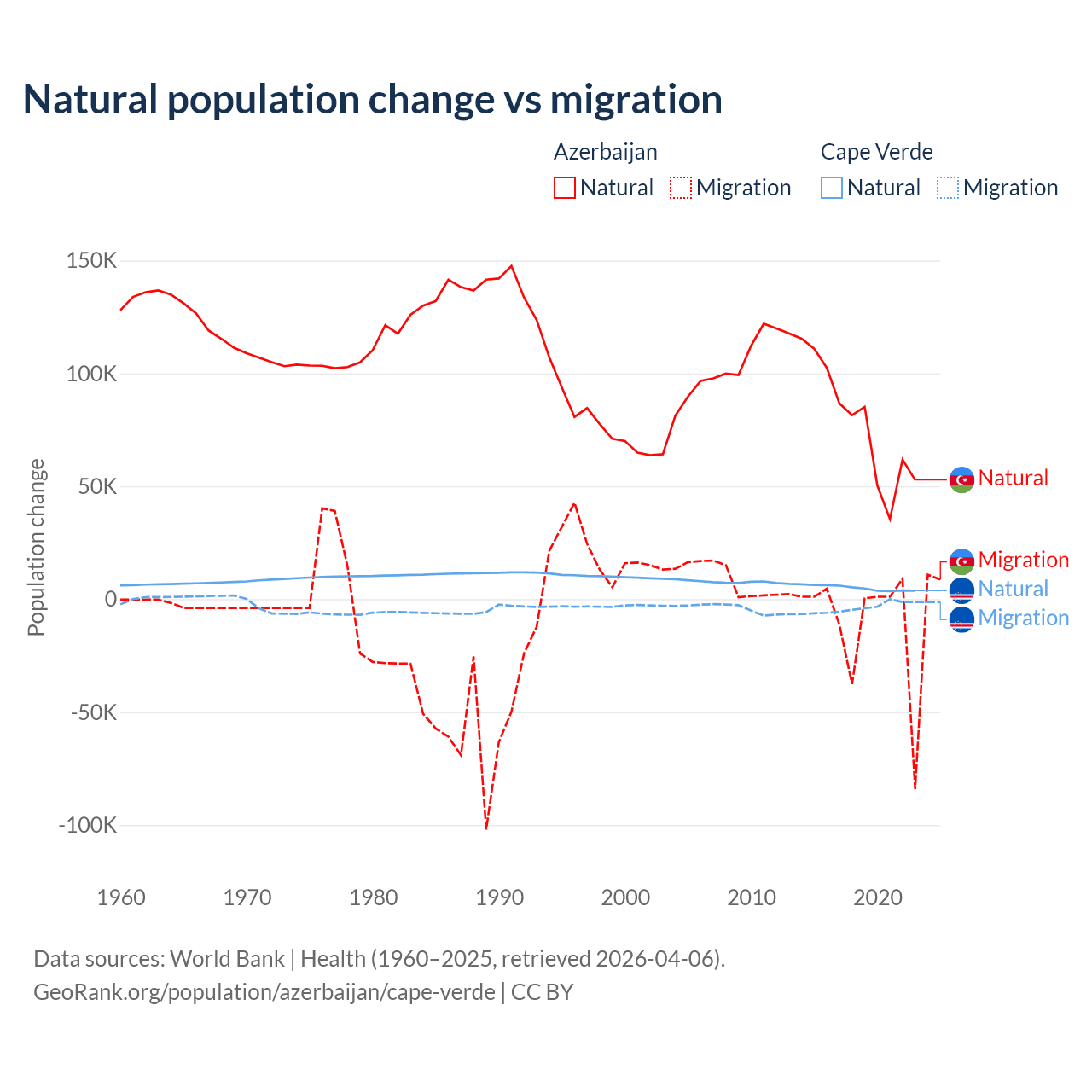 Over the last 10 years, 87.2% of the population change in Azerbaijan is from natural causes (a gain of 782,840 people) and 12.8% is from migration (a loss of 114,572 people). In Cape Verde 56.4% is from natural causes (a gain of 50,193 people) and 43.6% is from migration (a loss of 38,879 people).