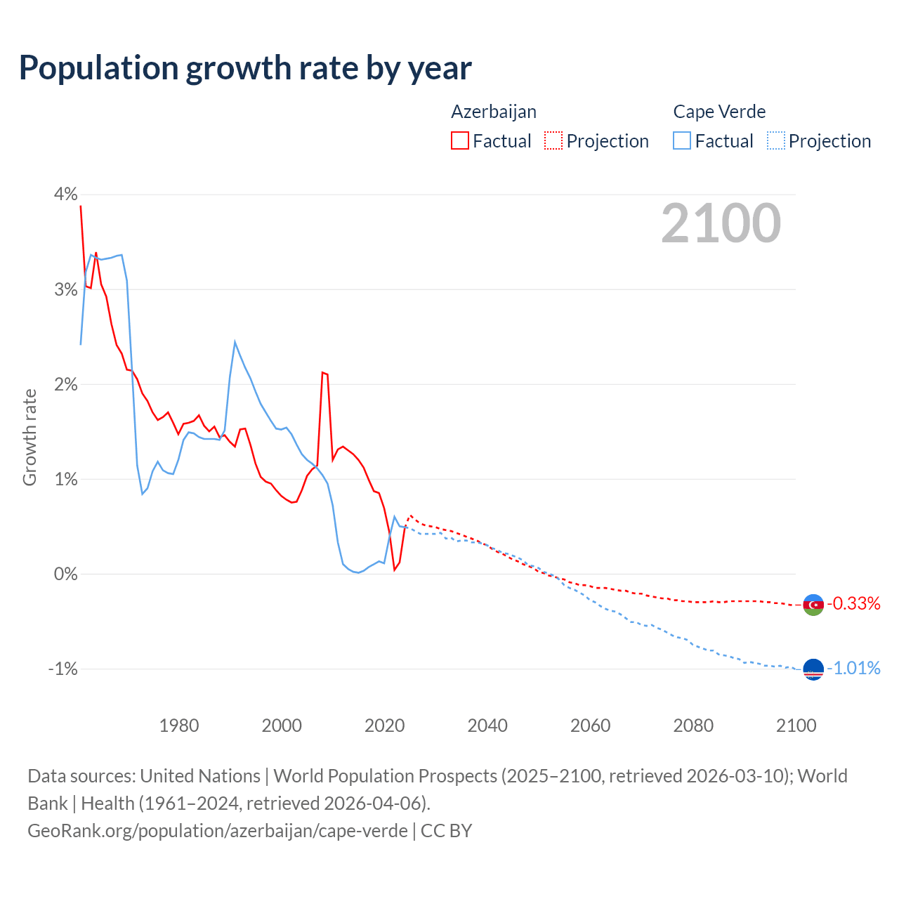 - For the last 10 years, Azerbaijan has had an average growth rate of +0.73% per year vs +0.22% in Cape Verde.