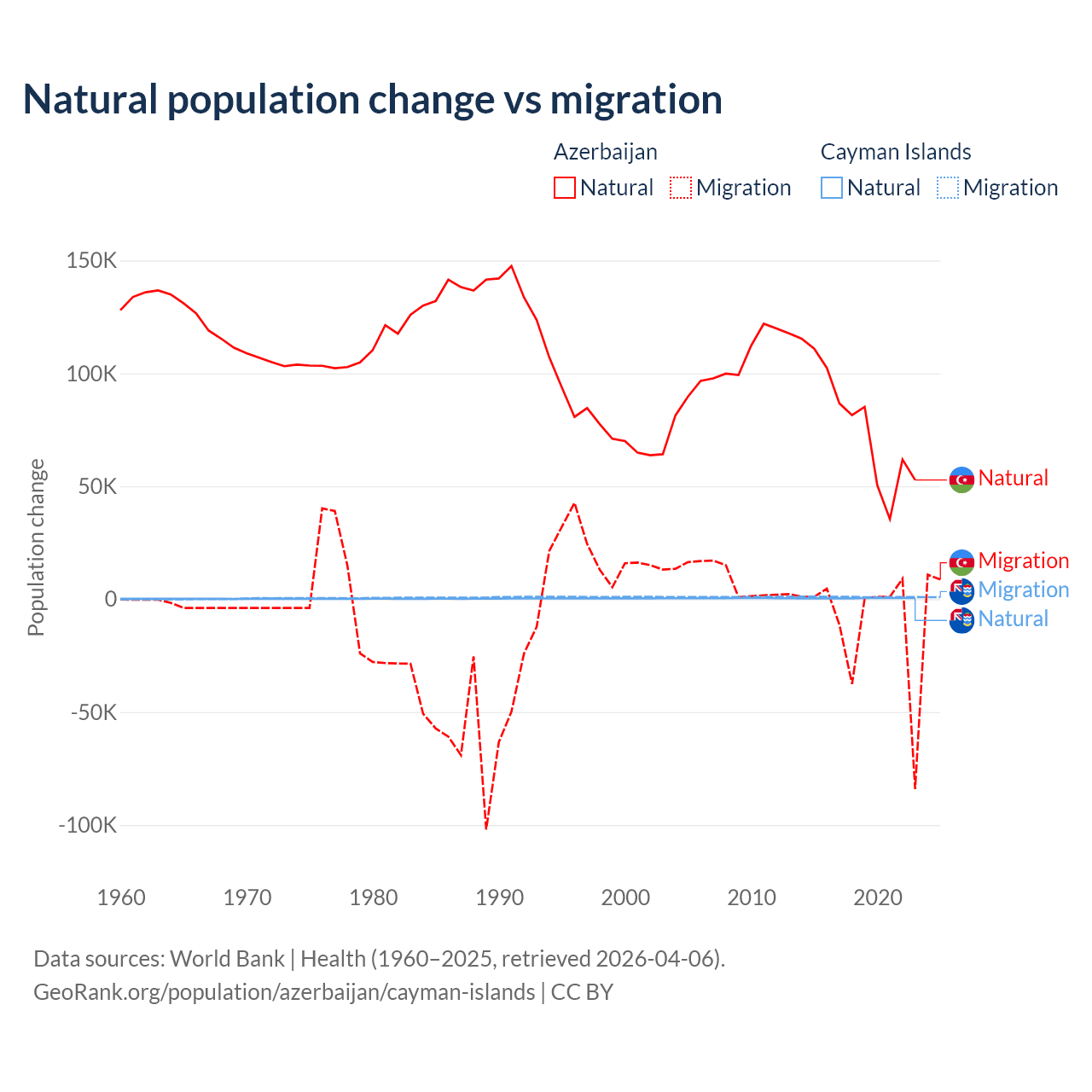 Over the last 10 years, 87.2% of the population change in Azerbaijan is from natural causes (a gain of 782,840 people) and 12.8% is from migration (a loss of 114,572 people). In the Cayman Islands 31.1% is from natural causes (a gain of 4,468 people) and 68.9% is from migration (a gain of 9,879 people).