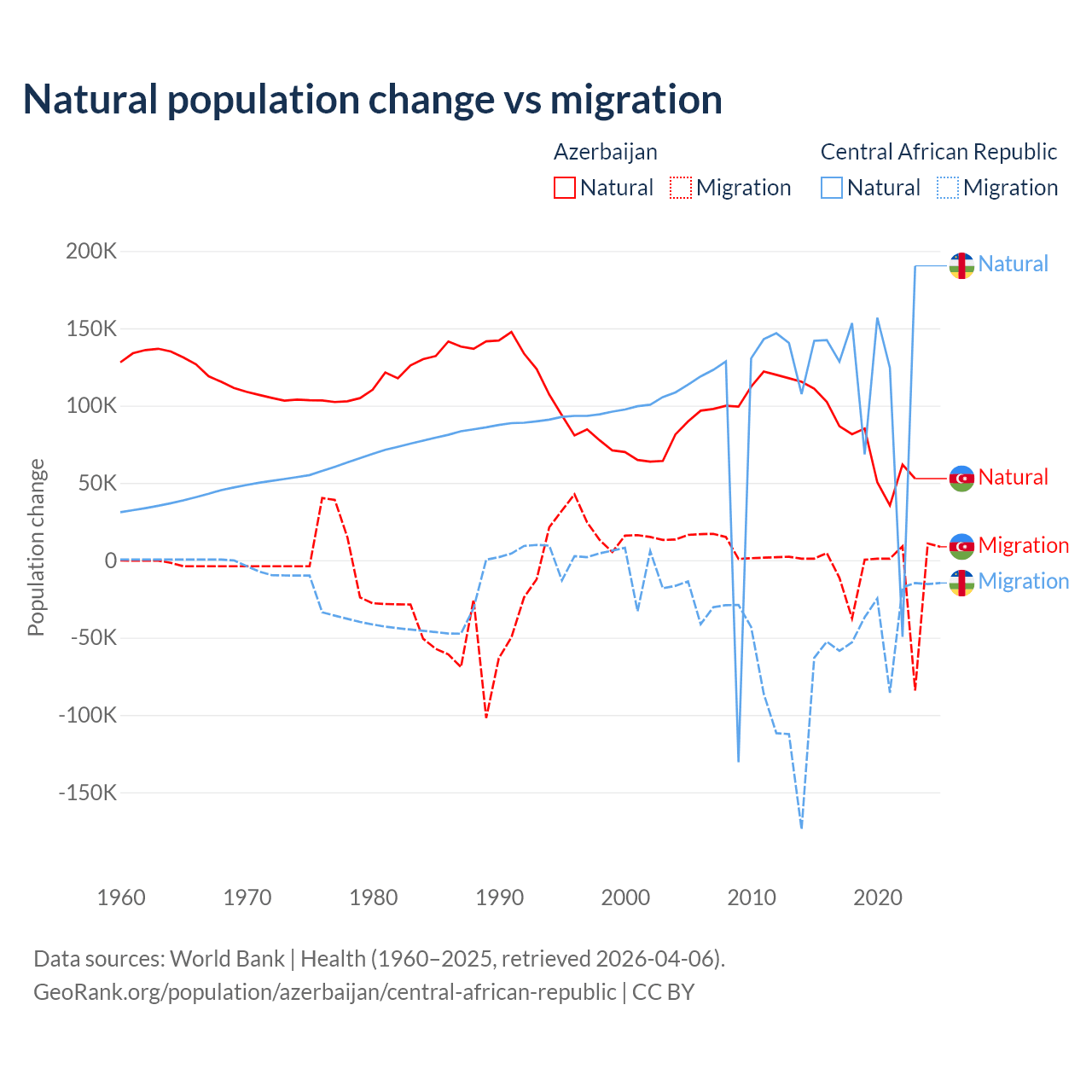 Over the last 10 years, 87.2% of the population change in Azerbaijan is from natural causes (a gain of 782,840 people) and 12.8% is from migration (a loss of 114,572 people). In the Central African Republic 66.7% is from natural causes (a gain of 1,164,312 people) and 33.3% is from migration (a loss of 580,593 people).