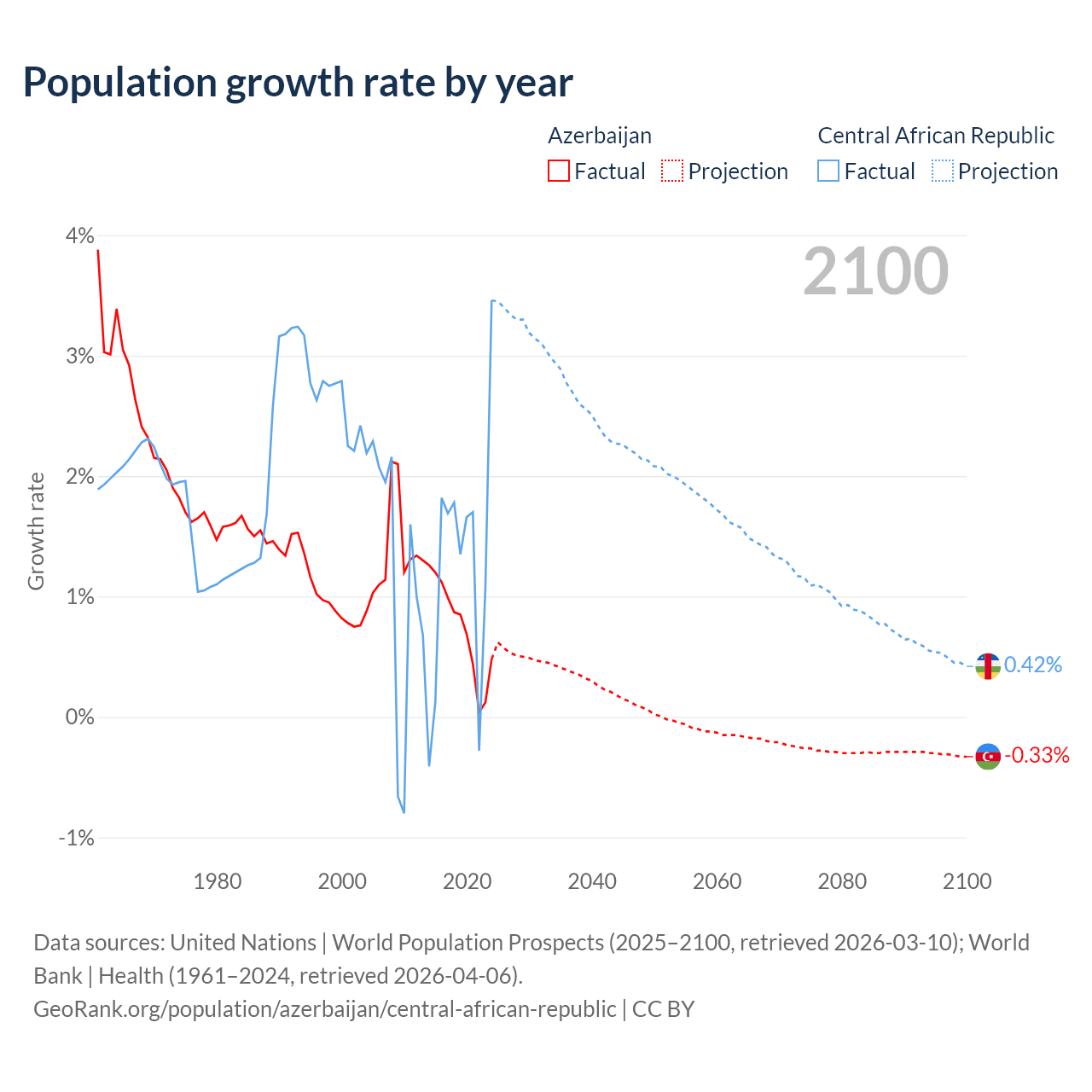 - For the last 10 years, Azerbaijan has had an average growth rate of +0.73% per year vs +1.27% in the Central African Republic.