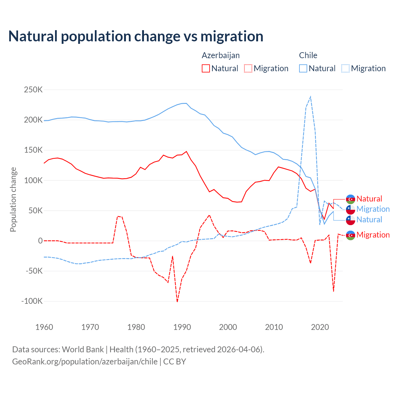Over the last 10 years, 87.2% of the population change in Azerbaijan is from natural causes (a gain of 782,840 people) and 12.8% is from migration (a loss of 114,572 people). In Chile 43.5% is from natural causes (a gain of 844,683 people) and 56.5% is from migration (a gain of 1,097,597 people).