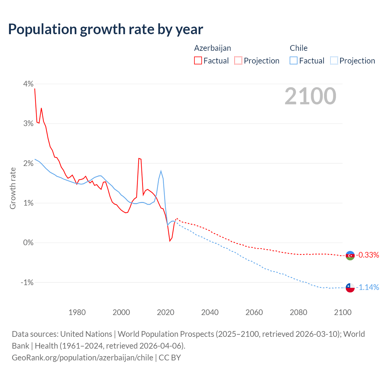 - For the last 10 years, Azerbaijan has had an average growth rate of +0.73% per year vs +1.02% in Chile.