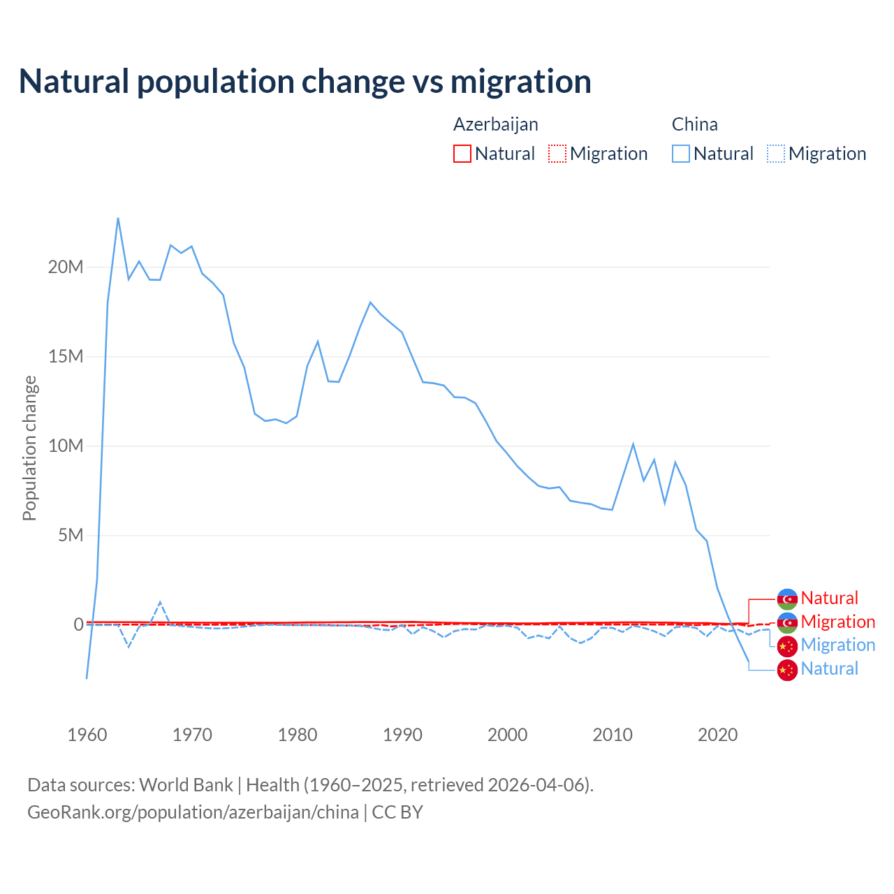 Over the last 10 years, 87.2% of the population change in Azerbaijan is from natural causes (a gain of 782,840 people) and 12.8% is from migration (a loss of 114,572 people). In China 92.5% is from natural causes (a gain of 42,414,528 people) and 7.53% is from migration (a loss of 3,452,923 people).