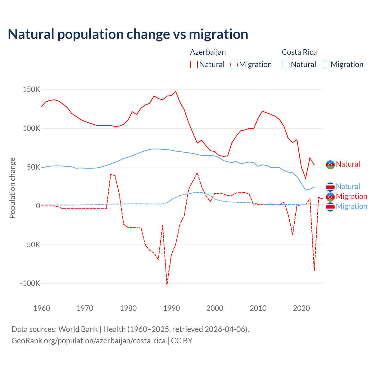 Over the last 10 years, 87.2% of the population change in Azerbaijan is from natural causes (a gain of 782,840 people) and 12.8% is from migration (a loss of 114,572 people). In Costa Rica 96.3% is from natural causes (a gain of 362,624 people) and 3.69% is from migration (a gain of 13,900 people).