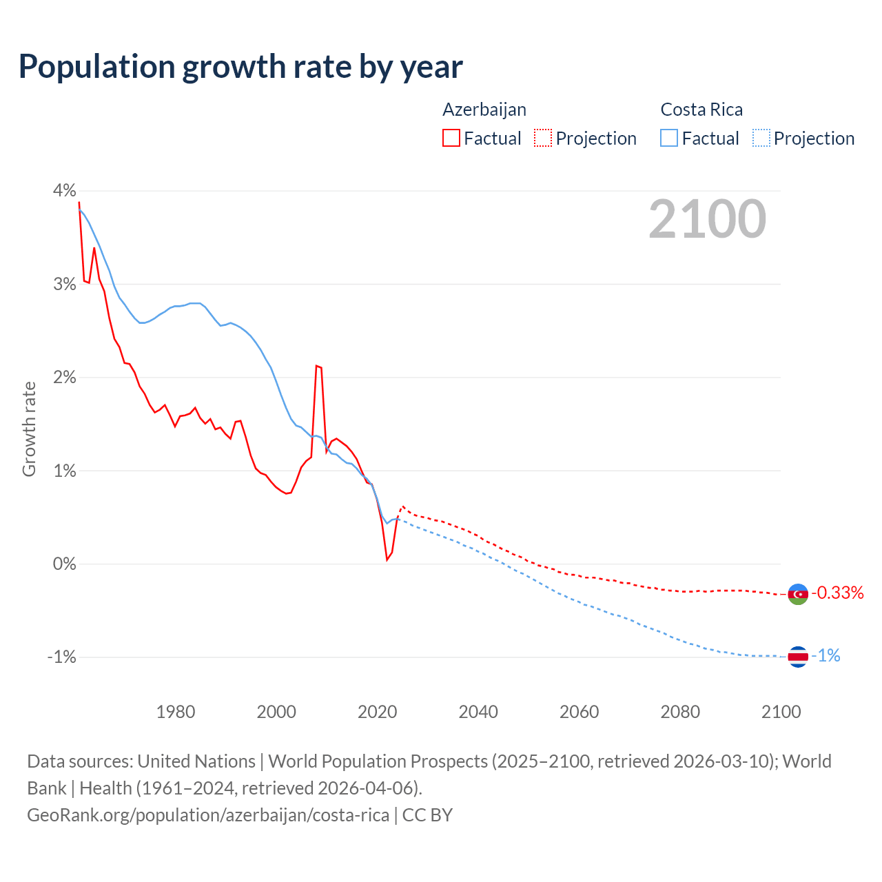 - For the last 10 years, Azerbaijan has had an average growth rate of +0.73% per year vs +0.77% in Costa Rica.