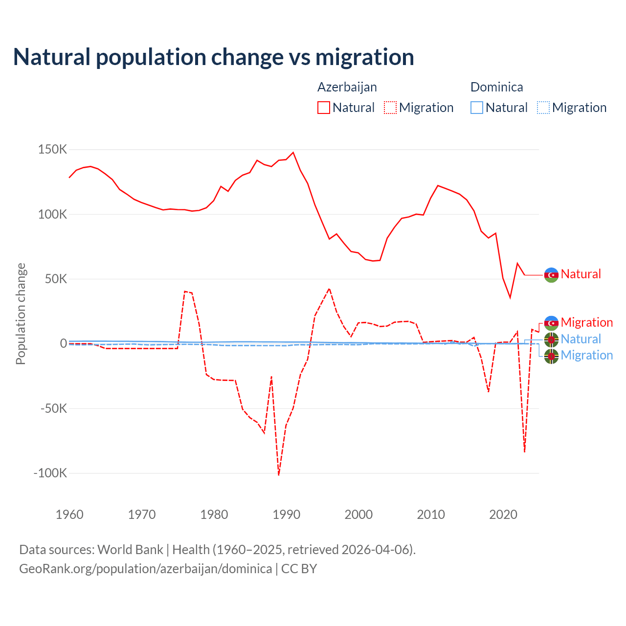 Over the last 10 years, 87.2% of the population change in Azerbaijan is from natural causes (a gain of 782,840 people) and 12.8% is from migration (a loss of 114,572 people). In Dominica 4.63% is from natural causes (a loss of 190 people) and 95.4% is from migration (a loss of 3,914 people).