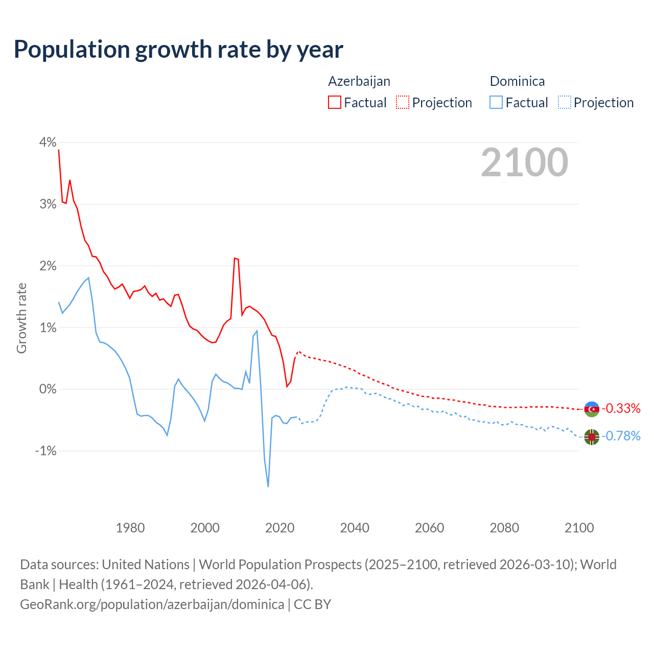 - For the last 10 years, Azerbaijan has had an average growth rate of +0.73% per year vs -0.47% in Dominica.