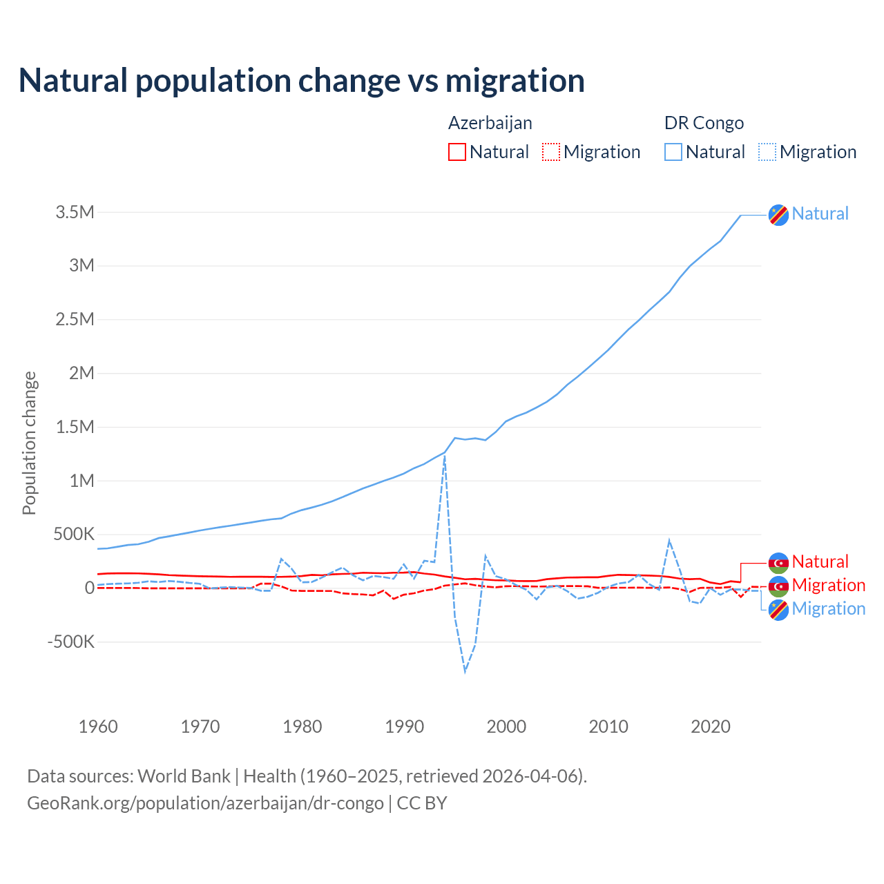 Over the last 10 years, 87.2% of the population change in Azerbaijan is from natural causes (a gain of 782,840 people) and 12.8% is from migration (a loss of 114,572 people). In the DR Congo 99.1% is from natural causes (a gain of 30,150,516 people) and 0.89% is from migration (a gain of 270,872 people).