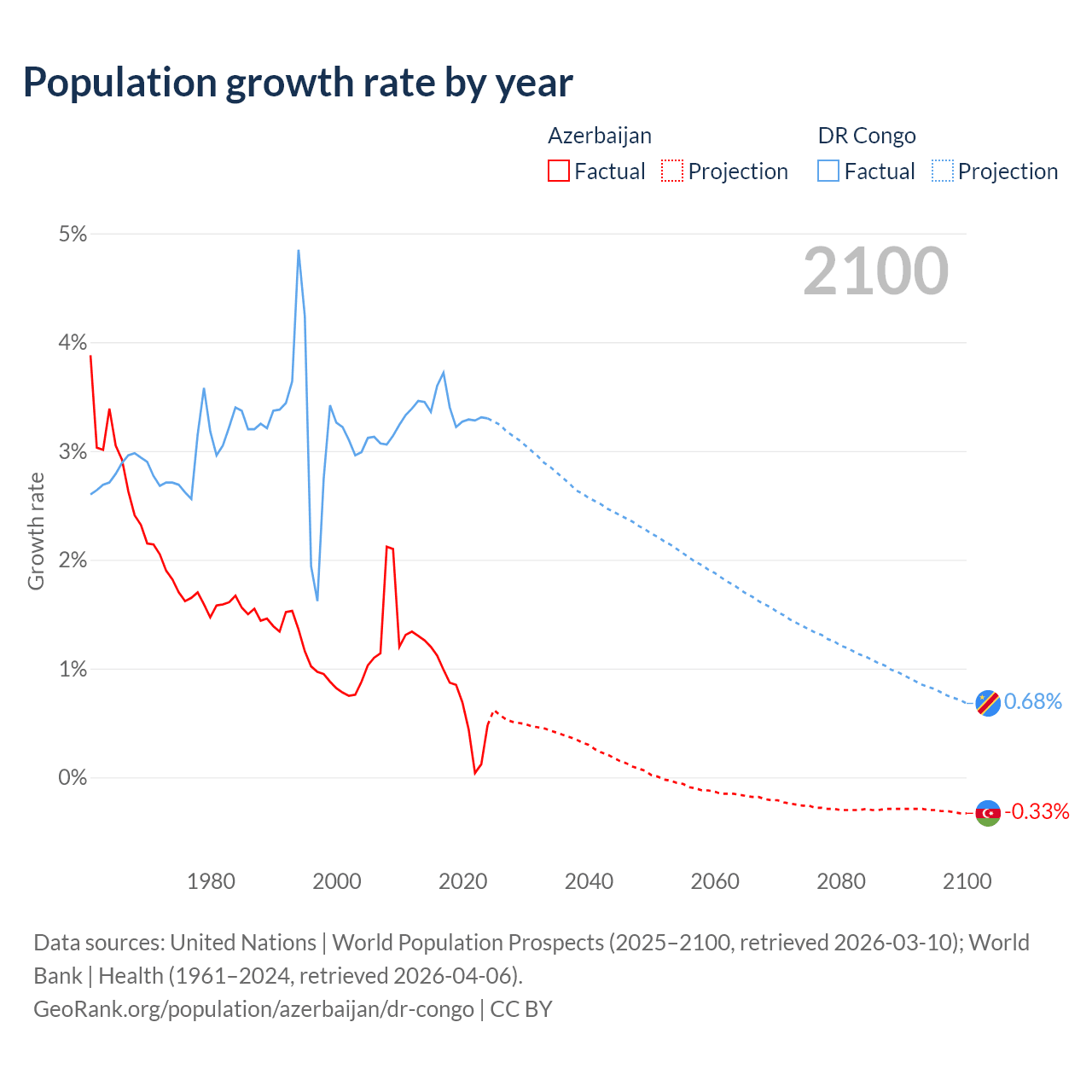 - For the last 10 years, Azerbaijan has had an average growth rate of +0.73% per year vs +3.38% in the DR Congo.