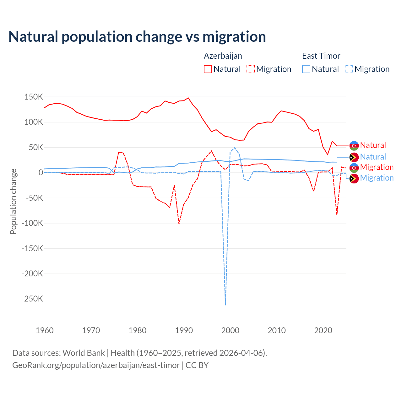 Over the last 10 years, 87.2% of the population change in Azerbaijan is from natural causes (a gain of 782,840 people) and 12.8% is from migration (a loss of 114,572 people). In East Timor 98.3% is from natural causes (a gain of 217,698 people) and 1.66% is from migration (a gain of 3,665 people).