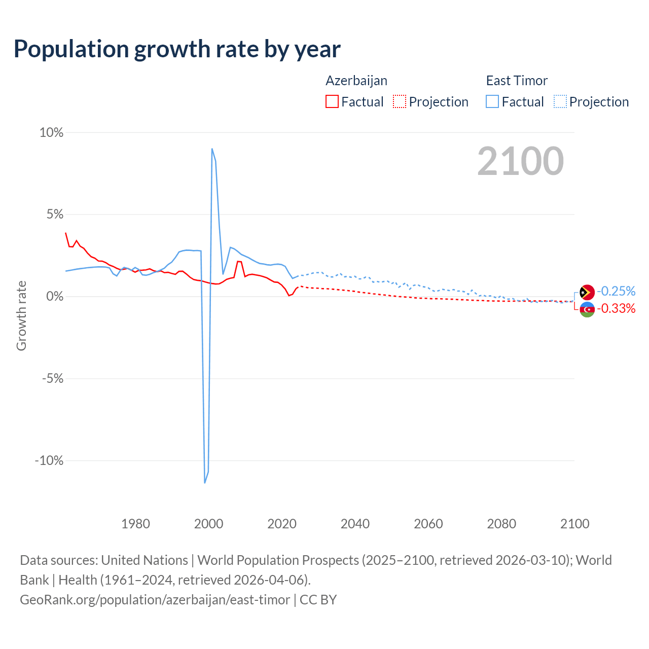 - For the last 10 years, Azerbaijan has had an average growth rate of +0.73% per year vs +1.74% in East Timor.