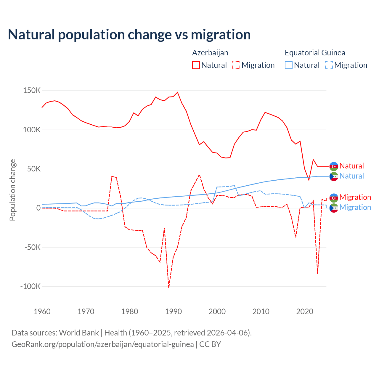 Over the last 10 years, 87.2% of the population change in Azerbaijan is from natural causes (a gain of 782,840 people) and 12.8% is from migration (a loss of 114,572 people). In Equatorial Guinea 77% is from natural causes (a gain of 382,745 people) and 23% is from migration (a gain of 114,024 people).