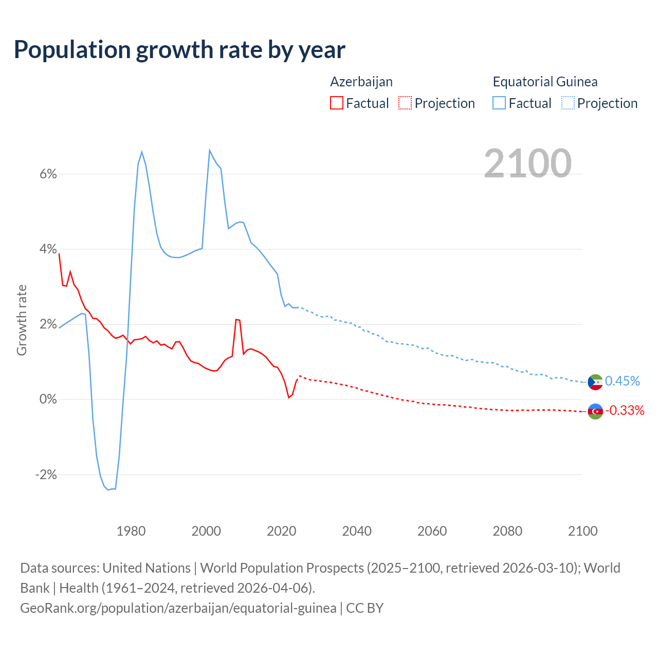 - For the last 10 years, Azerbaijan has had an average growth rate of +0.73% per year vs +3.15% in Equatorial Guinea.