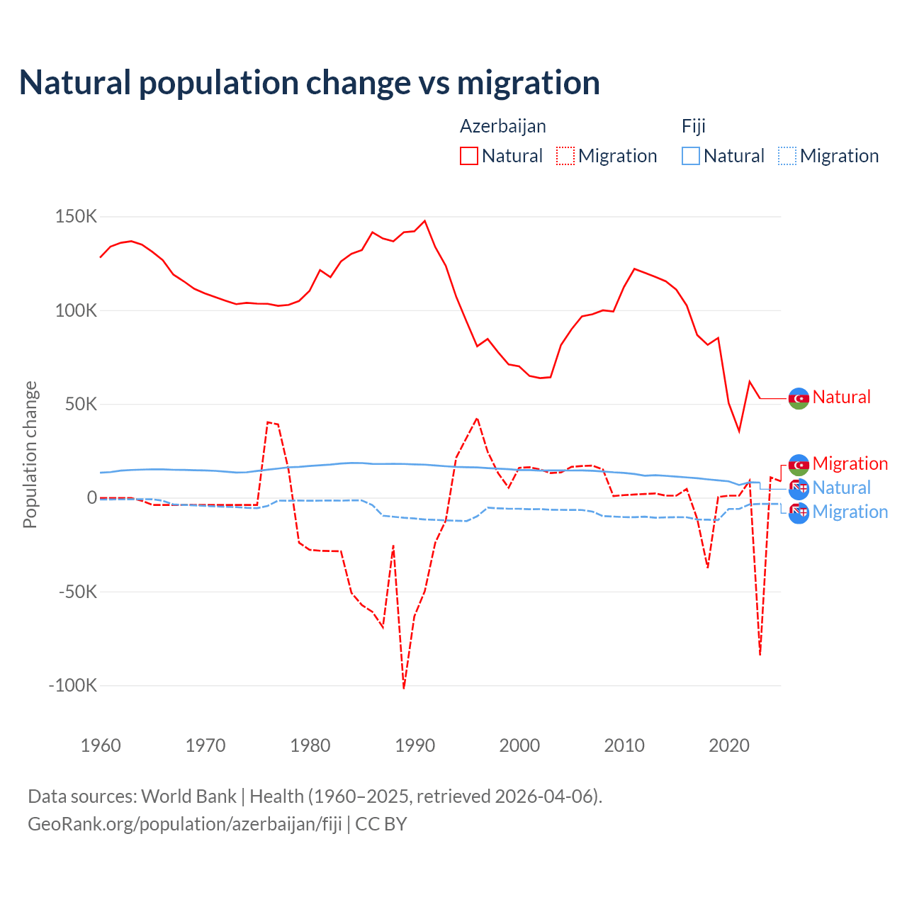 Over the last 10 years, 87.2% of the population change in Azerbaijan is from natural causes (a gain of 782,840 people) and 12.8% is from migration (a loss of 114,572 people). In Fiji 52.6% is from natural causes (a gain of 94,971 people) and 47.4% is from migration (a loss of 85,415 people).