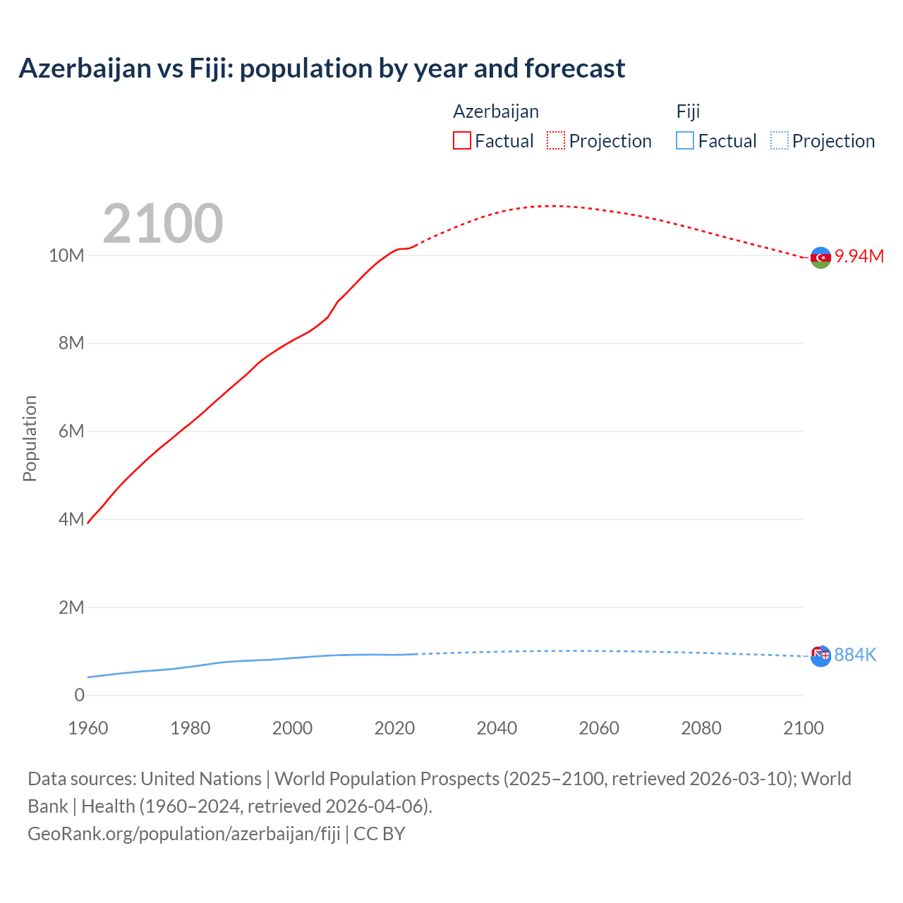 The latest officially reported population of Azerbaijan was 10,202,830 in 2024 vs 928,784 people in Fiji in 2024. In 2026, based on the adjusted UN estimation, the current Azerbaijan's population is 10,338,778 people compared to 938,628 in Fiji.
