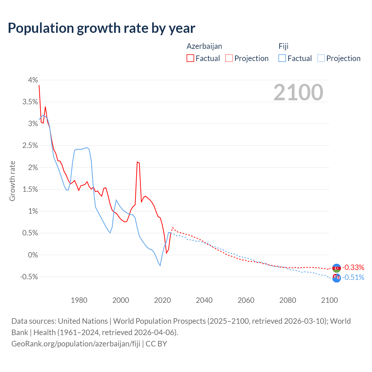 - For the last 10 years, Azerbaijan has had an average growth rate of +0.73% per year vs +0.12% in Fiji.