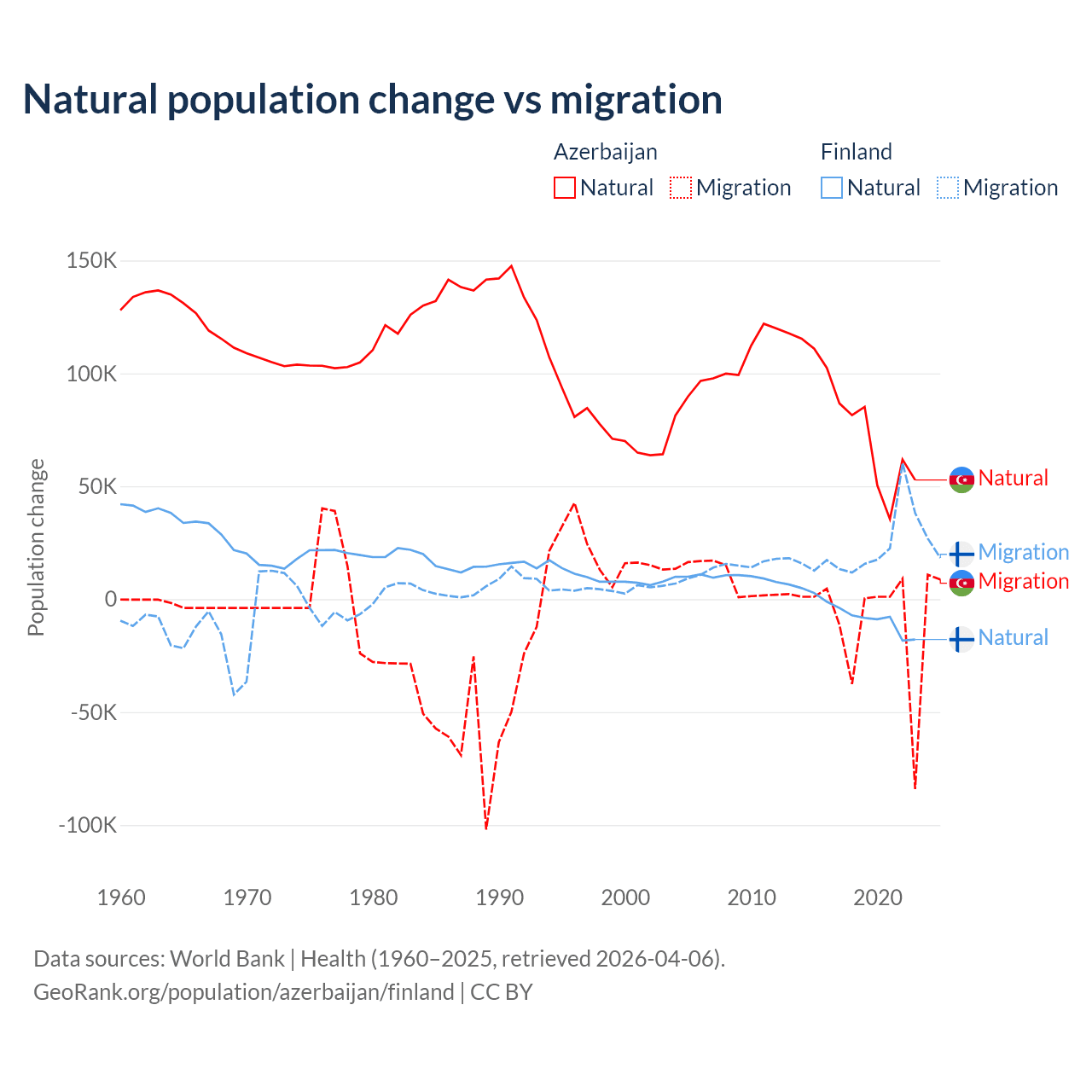 Over the last 10 years, 87.2% of the population change in Azerbaijan is from natural causes (a gain of 782,840 people) and 12.8% is from migration (a loss of 114,572 people). In Finland 22.5% is from natural causes (a loss of 65,560 people) and 77.5% is from migration (a gain of 225,237 people).