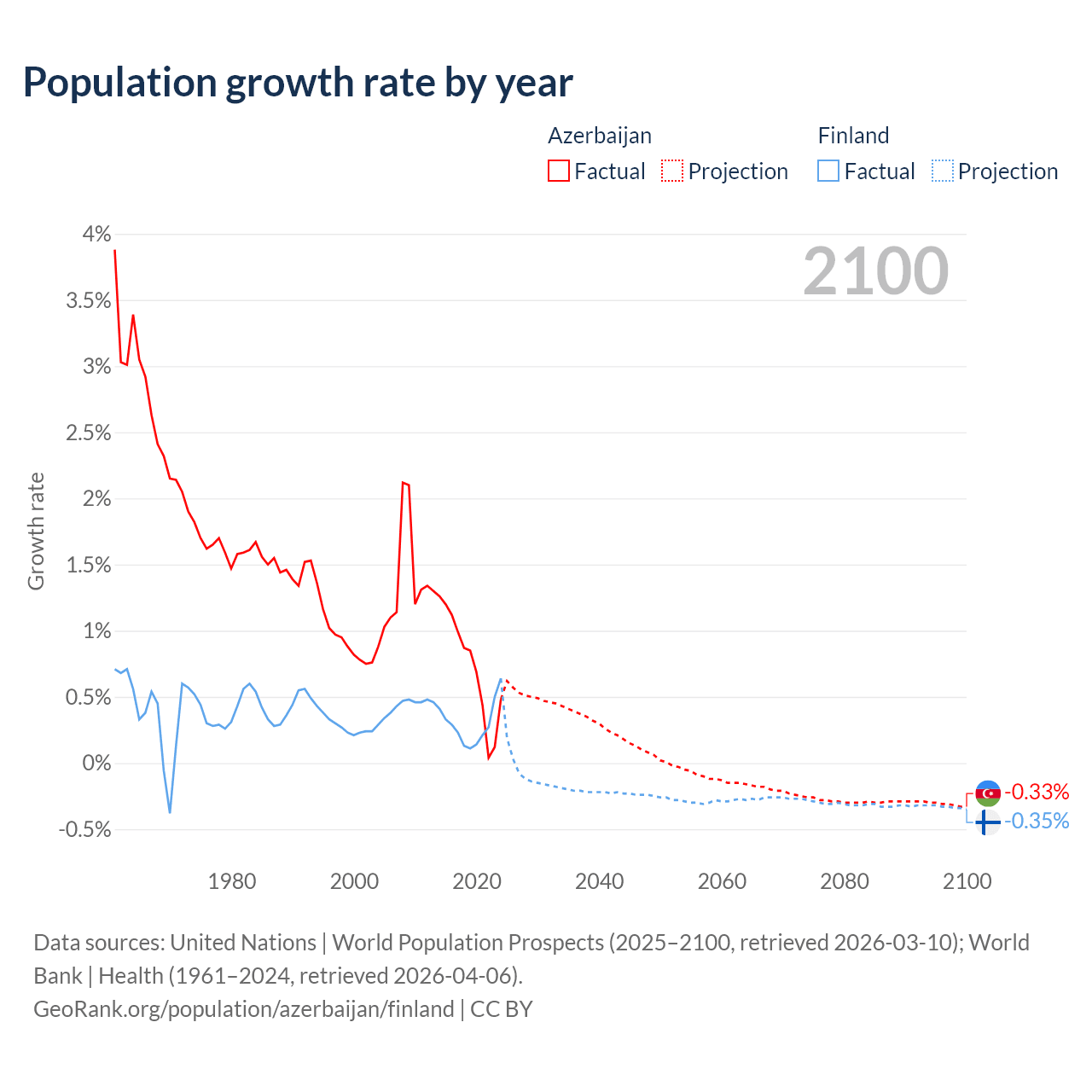 - For the last 10 years, Azerbaijan has had an average growth rate of +0.73% per year vs +0.3% in Finland.