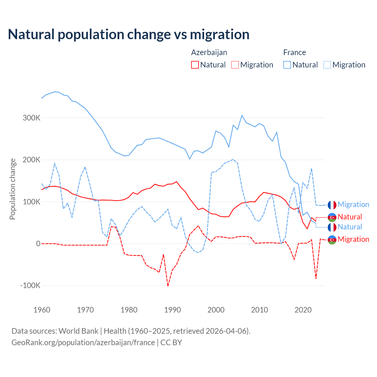 Over the last 10 years, 87.2% of the population change in Azerbaijan is from natural causes (a gain of 782,840 people) and 12.8% is from migration (a loss of 114,572 people). In France 59.5% is from natural causes (a gain of 1,359,540 people) and 40.5% is from migration (a gain of 923,723 people).