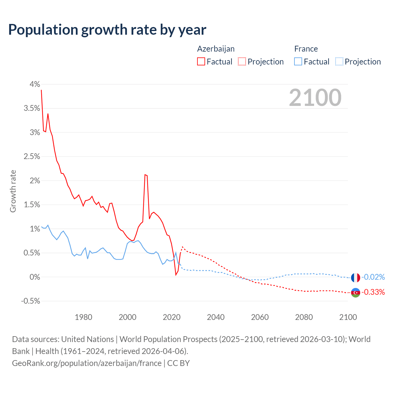 - For the last 10 years, Azerbaijan has had an average growth rate of +0.73% per year vs +0.35% in France.