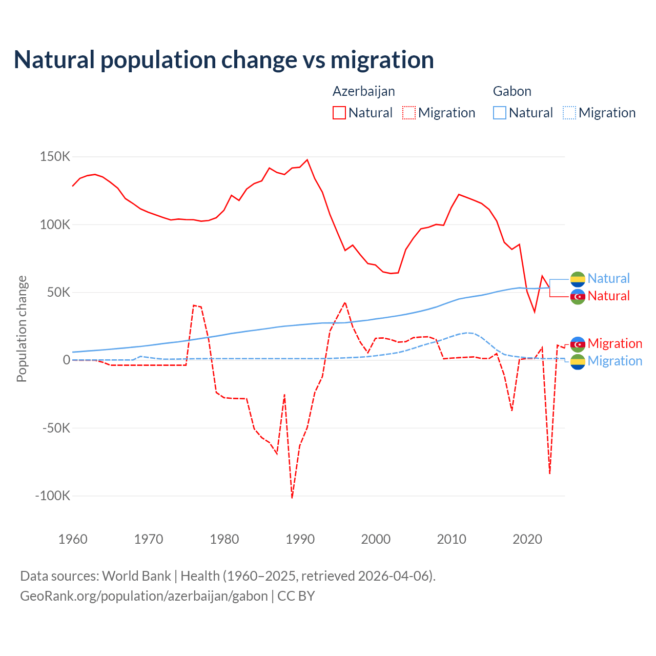 Over the last 10 years, 87.2% of the population change in Azerbaijan is from natural causes (a gain of 782,840 people) and 12.8% is from migration (a loss of 114,572 people). In Gabon 91.1% is from natural causes (a gain of 515,484 people) and 8.86% is from migration (a gain of 50,119 people).