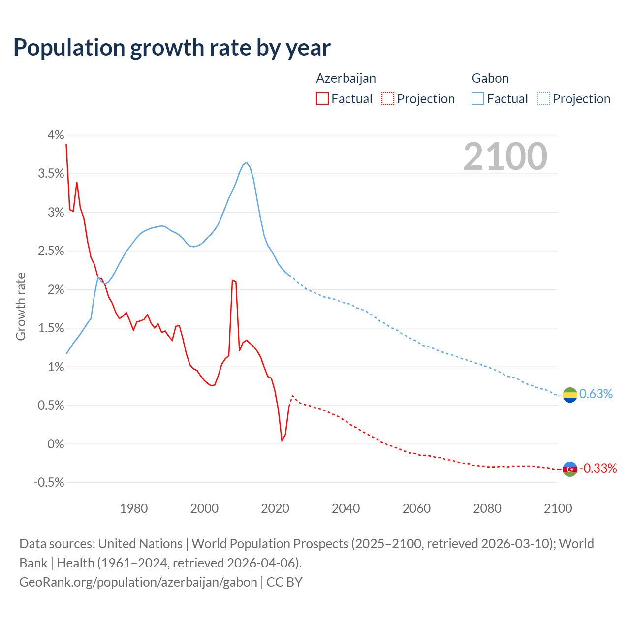 - For the last 10 years, Azerbaijan has had an average growth rate of +0.73% per year vs +2.61% in Gabon.