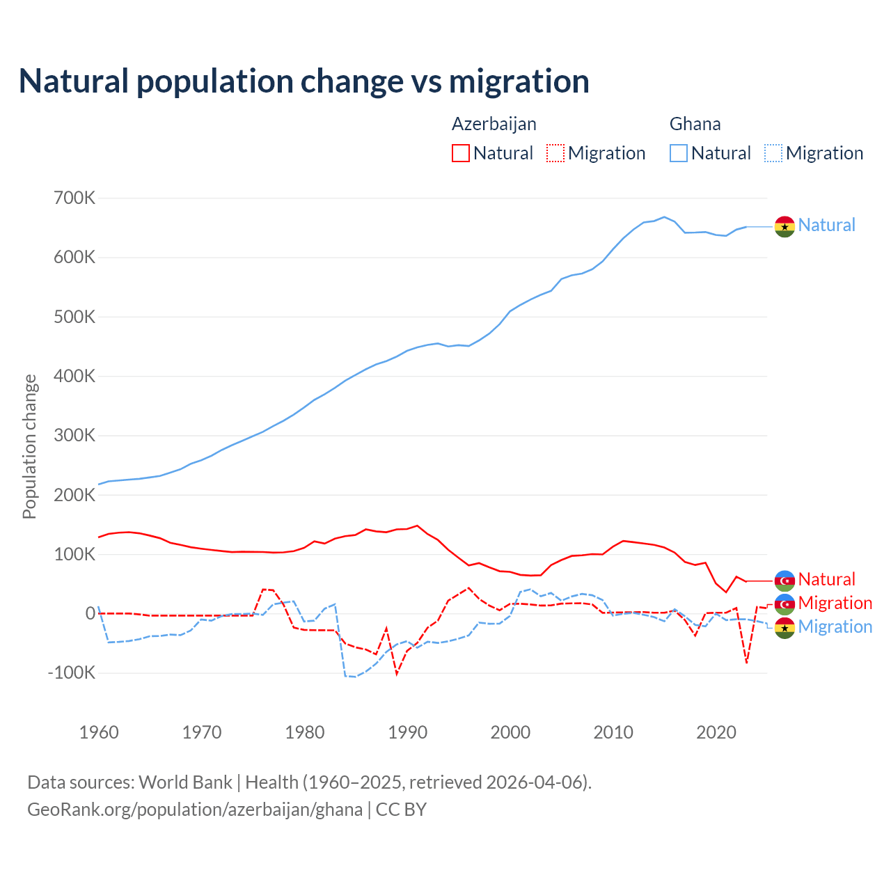 Over the last 10 years, 87.2% of the population change in Azerbaijan is from natural causes (a gain of 782,840 people) and 12.8% is from migration (a loss of 114,572 people). In Ghana 98.6% is from natural causes (a gain of 6,484,449 people) and 1.37% is from migration (a loss of 90,310 people).