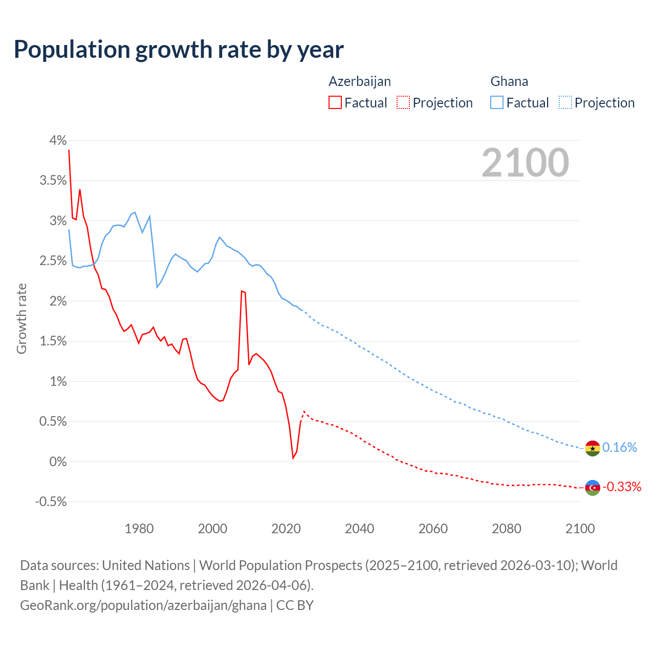 - For the last 10 years, Azerbaijan has had an average growth rate of +0.73% per year vs +2.1% in Ghana.