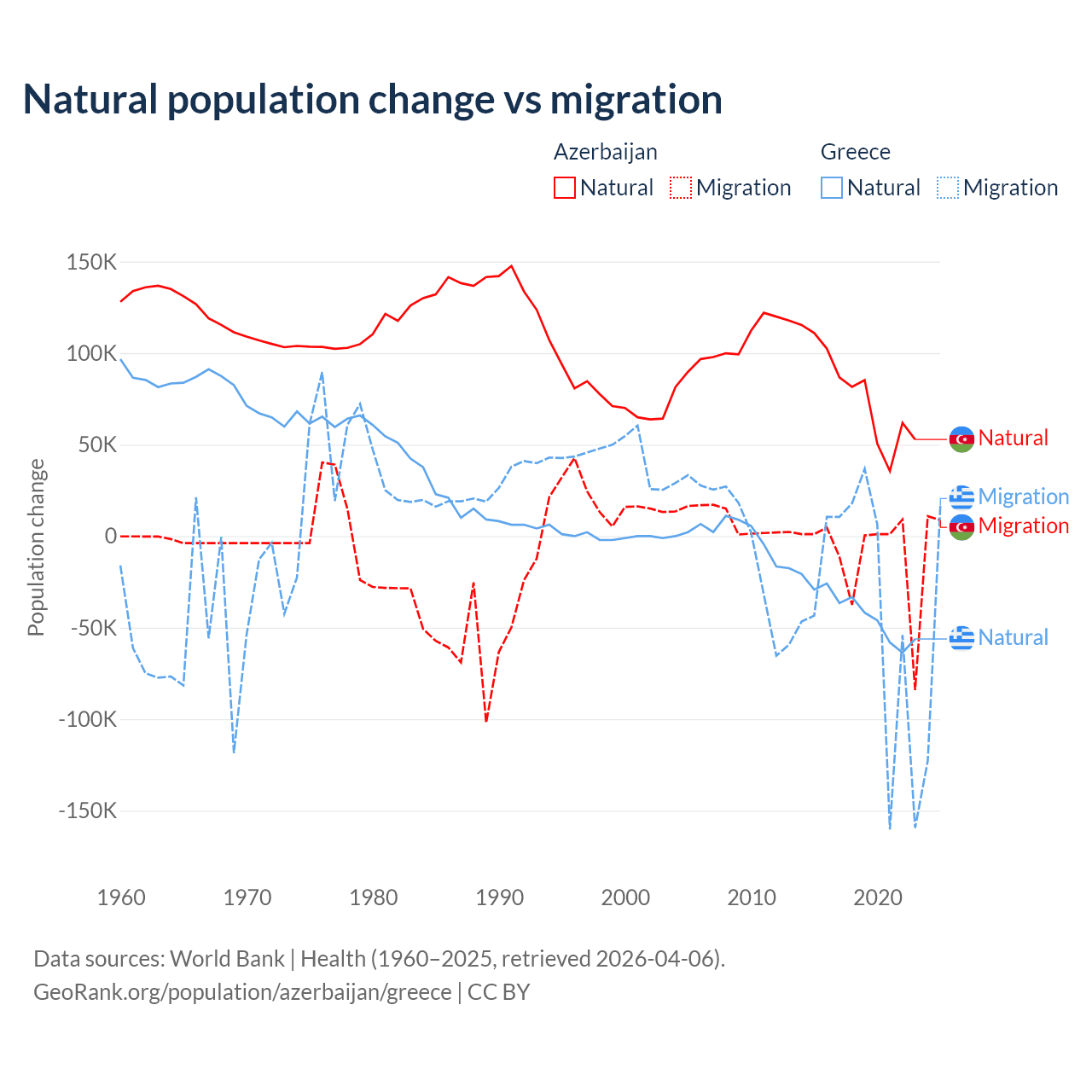 Over the last 10 years, 87.2% of the population change in Azerbaijan is from natural causes (a gain of 782,840 people) and 12.8% is from migration (a loss of 114,572 people). In Greece 51.9% is from natural causes (a loss of 411,426 people) and 48.1% is from migration (a loss of 381,824 people).