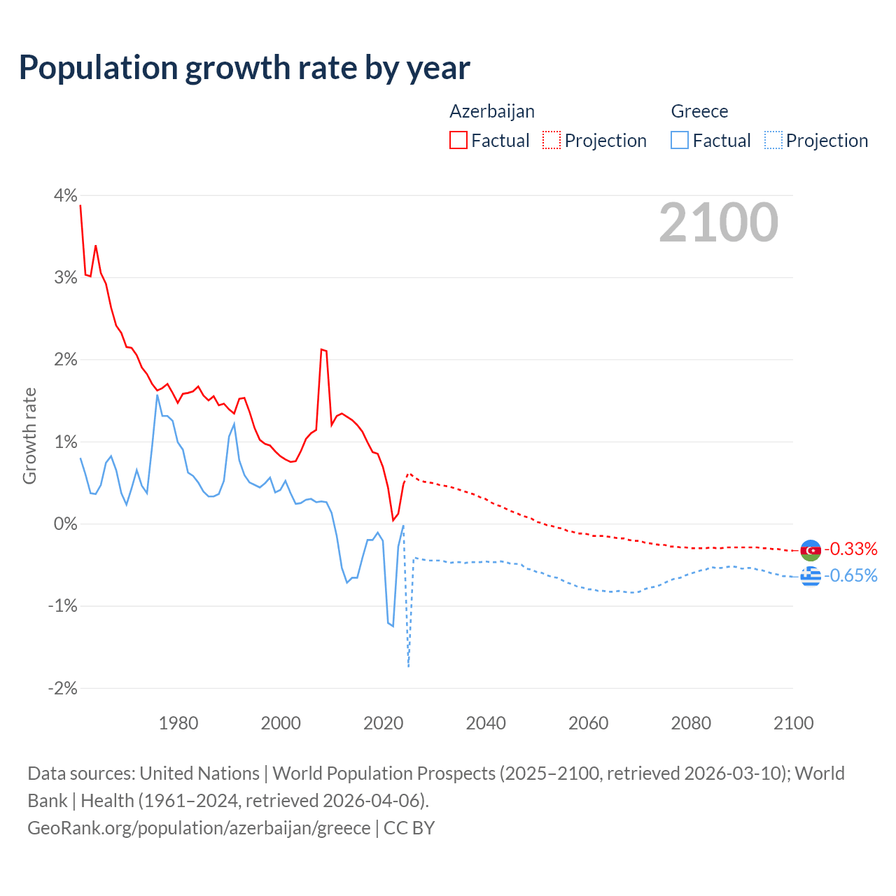 - For the last 10 years, Azerbaijan has had an average growth rate of +0.73% per year vs -0.47% in Greece.