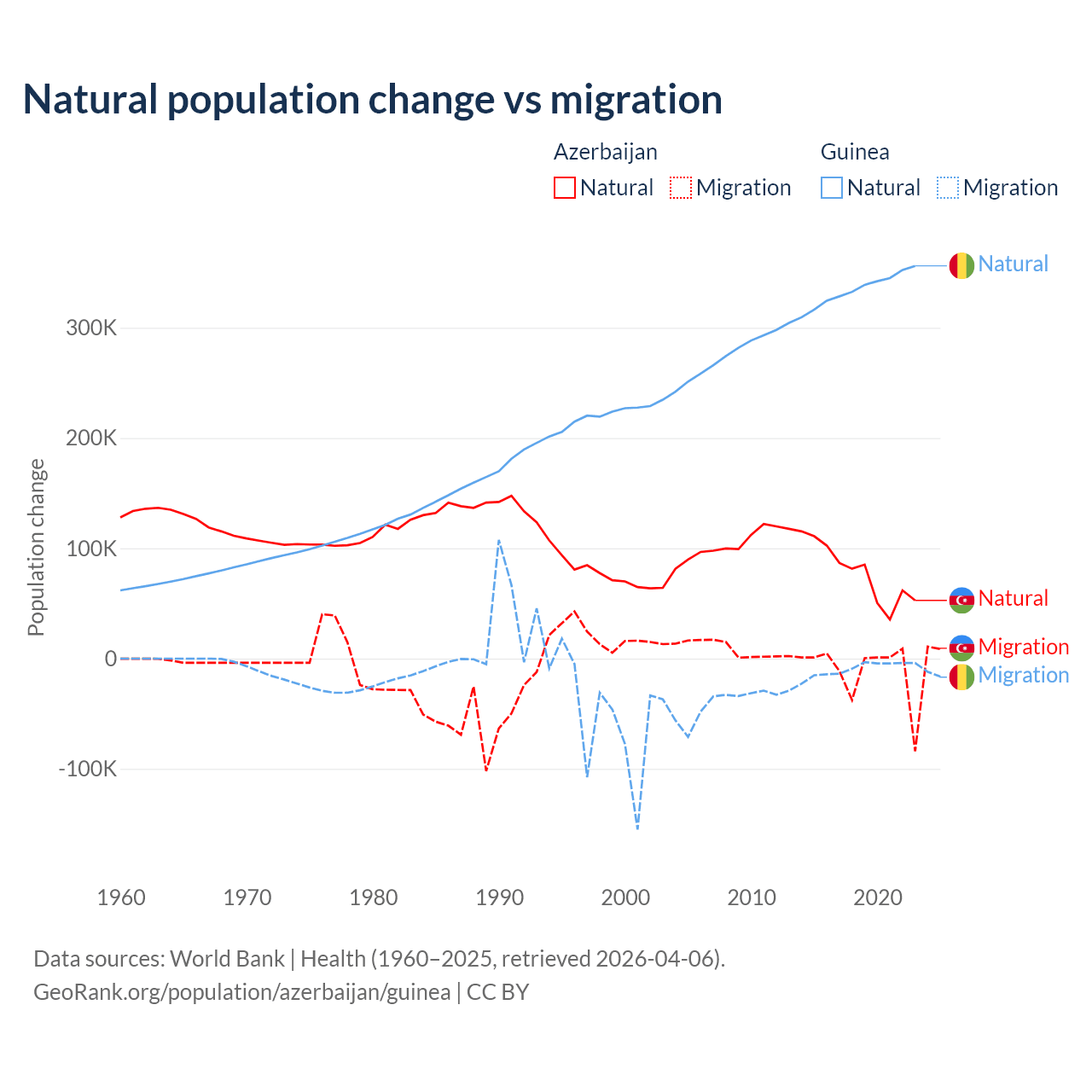 Over the last 10 years, 87.2% of the population change in Azerbaijan is from natural causes (a gain of 782,840 people) and 12.8% is from migration (a loss of 114,572 people). In Guinea 97.2% is from natural causes (a gain of 3,346,936 people) and 2.76% is from migration (a loss of 94,924 people).