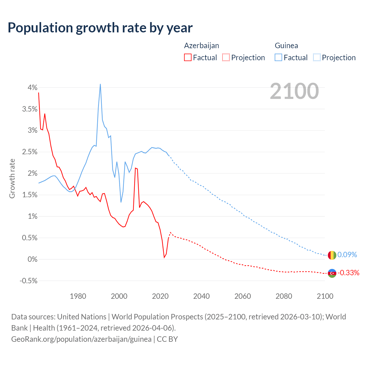 - For the last 10 years, Azerbaijan has had an average growth rate of +0.73% per year vs +2.54% in Guinea.
