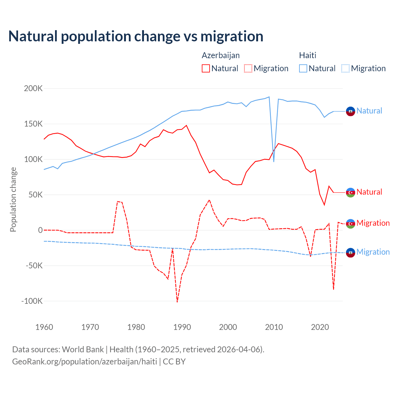 Over the last 10 years, 87.2% of the population change in Azerbaijan is from natural causes (a gain of 782,840 people) and 12.8% is from migration (a loss of 114,572 people). In Haiti 83.9% is from natural causes (a gain of 1,740,319 people) and 16.1% is from migration (a loss of 333,076 people).